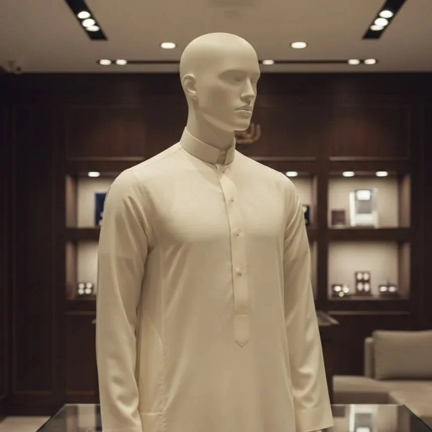 Yet, most retailers in Saudi Arabia continue to display premium Thobes on generic, ill-fitting forms that collapse the garment’s structure and cheapen its perceived value.